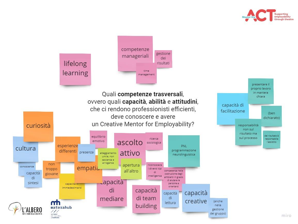 The two Italian partners (Materahub and L’Albero) planned the action together, dividing the tasks and the areas of interest between them. They involved 8 professionals from the “performing Arts” sector and the “Coaching / mentoring” sector, inviting 4 actors/actresses, 1 business coach and 3 navigators from ANPAL services, National Agency for Active Employment Policies. The “Navigators” are a new Italian profile that has the task of directing and guiding in the labour market all those who need and request it through the Employment Centres.